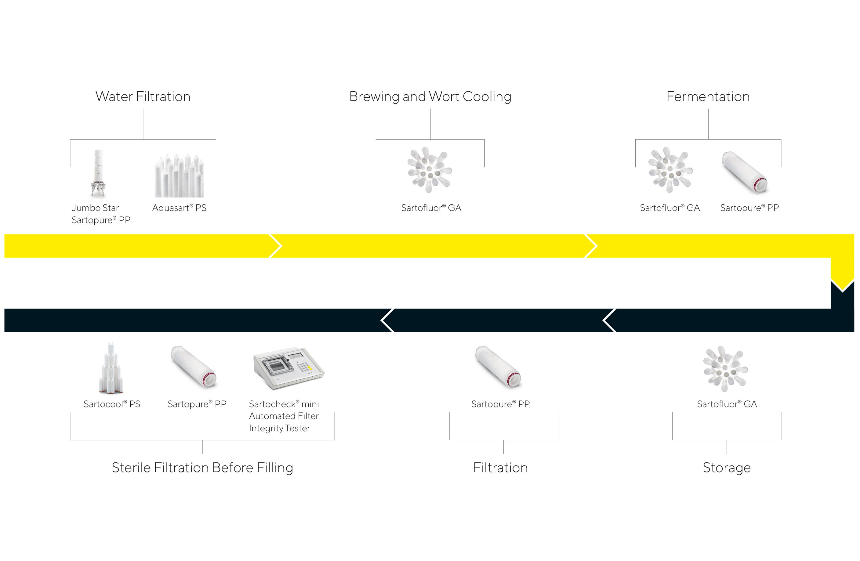 미세 필터나 트랩 필터를 사용하든 이 단계에서는 싸토리우스® 필터를 권장합니다. 여과 목적에 따라 아쿠아싸트®, 싸토리우스® PP 및 싸토쿨® 필터를 사용할 수 있습니다. 후자는 생산성을 크게 높이고 비용을 절감합니다. 필터 카트리지 멸균 후 물, 맥주의 무균 여과 전에 여과 시스템을 점검하세요.