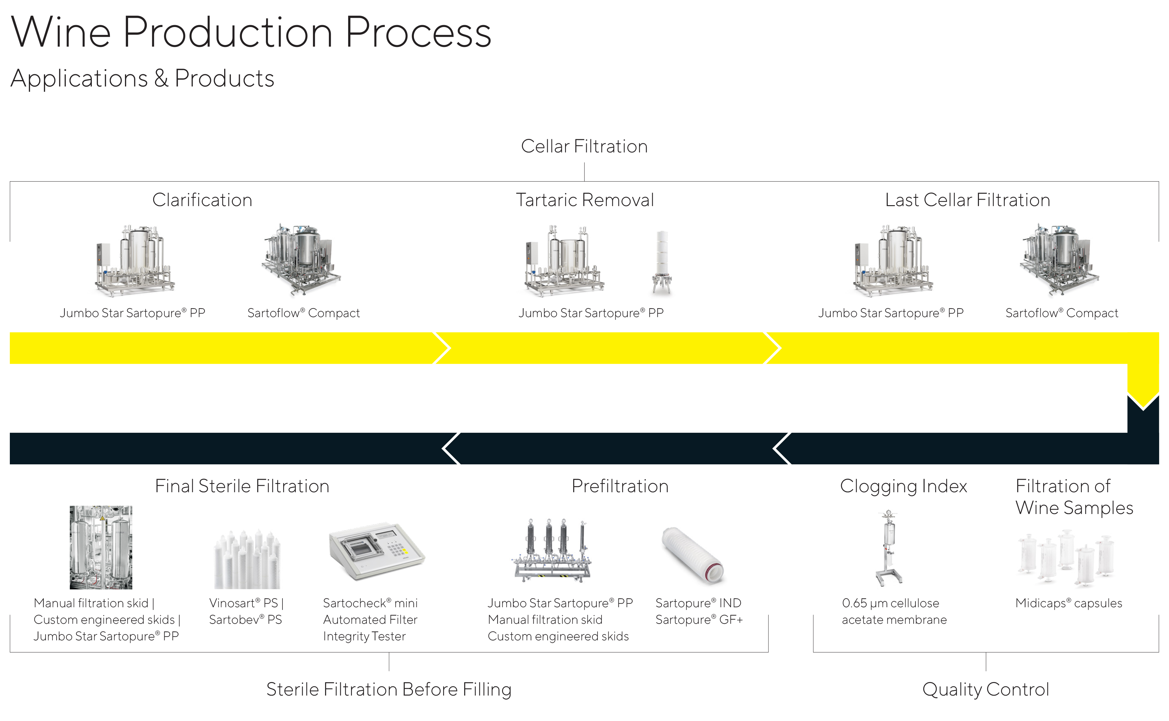 와인 저장고 여과 공정은 탱크 저장 전 탁도를 줄이고 주석산 결정을 제거하여 와인을 맑게 만듭니다. 일부 와인(주로 화이트 와인)은 주석산 결정을 침전시키기 위해 사전 냉각됩니다. 싸토리우스의 제품을 사용하면 다음과 같은 이점이 있습니다: